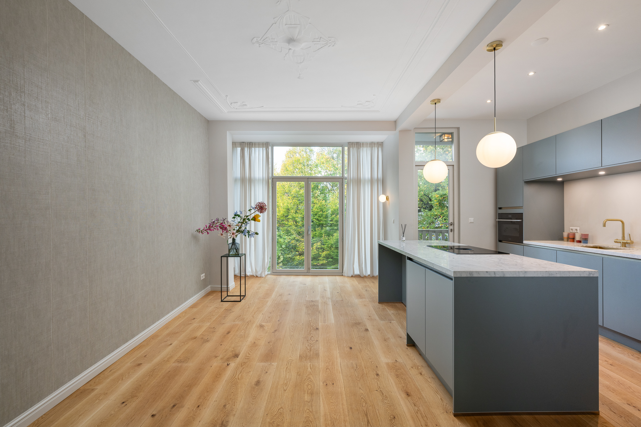 Via de entree kom je in de lichte en ruime woonkamer, waar de hoge plafonds en grote ramen direct een gevoel van ruimte geven. De moderne open keuken met kookeiland is strak afgewerkt en voorzien van diverse inbouwapparatuur. Vanuit de keuken stap je zo het balkon op: een fijne plek voor een kop koffie in de ochtend.