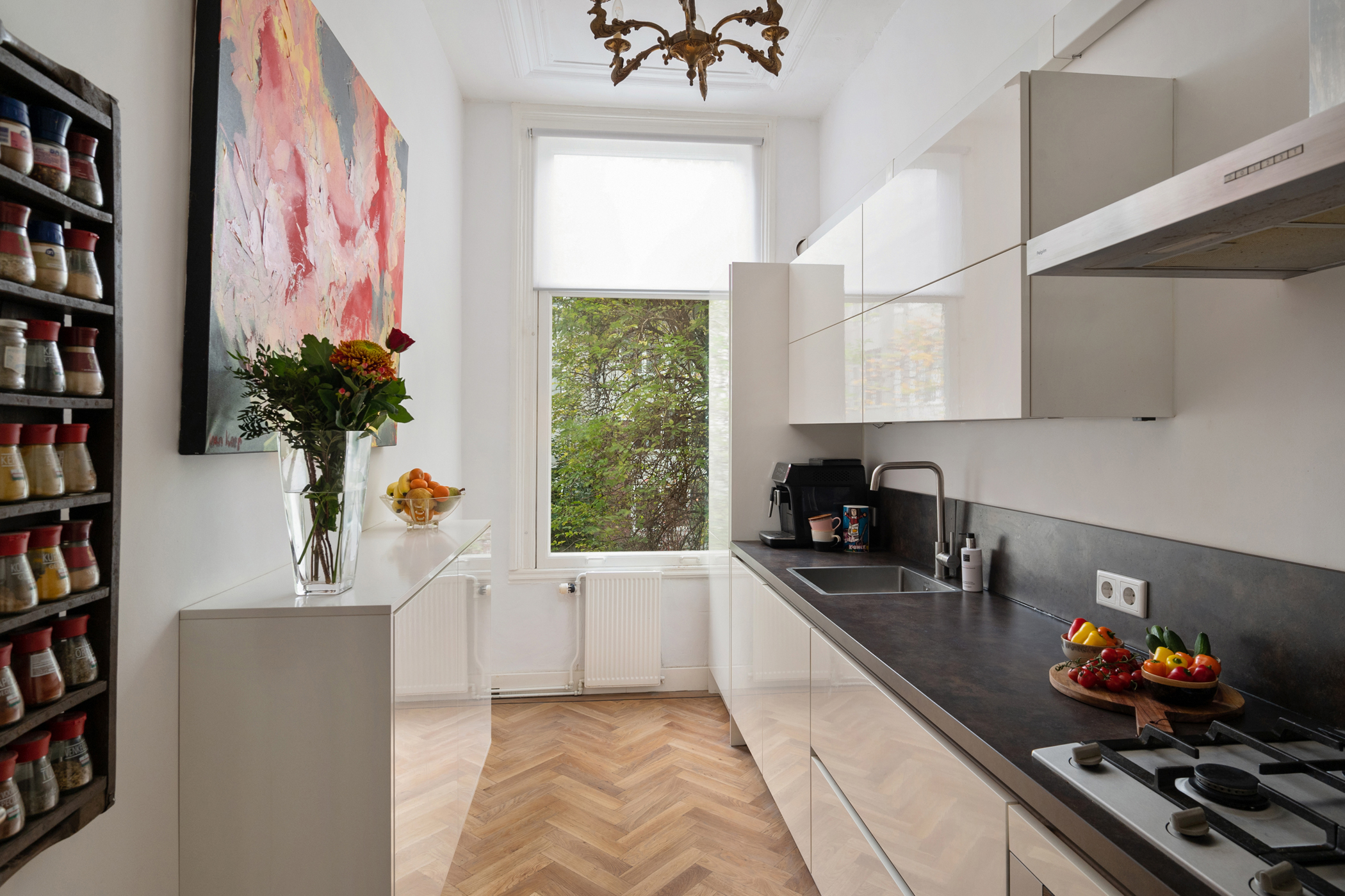 Aan de linkerzijde kom je middels een deur bij de woonkamer. Aan de voorzijde is een fijne eethoek gecreëerd en heb je twee grote raampartijen met prachtig glas-in-lood. De originele ornamenten zijn door de gehele woning terug te vinden. Aan de achterzijde een unieke schouw die nog werkend is. Heerlijk om hier op de bank te ploffen met een goed boek en een glas wijn. De keuken is via de hal te bereiken en heeft een praktische indeling. Deze is voorzien van verschillende inbouwapparatuur en heeft een moderne uitstraling door de hoogglans witte kasten en het keukenblad met betonlook.