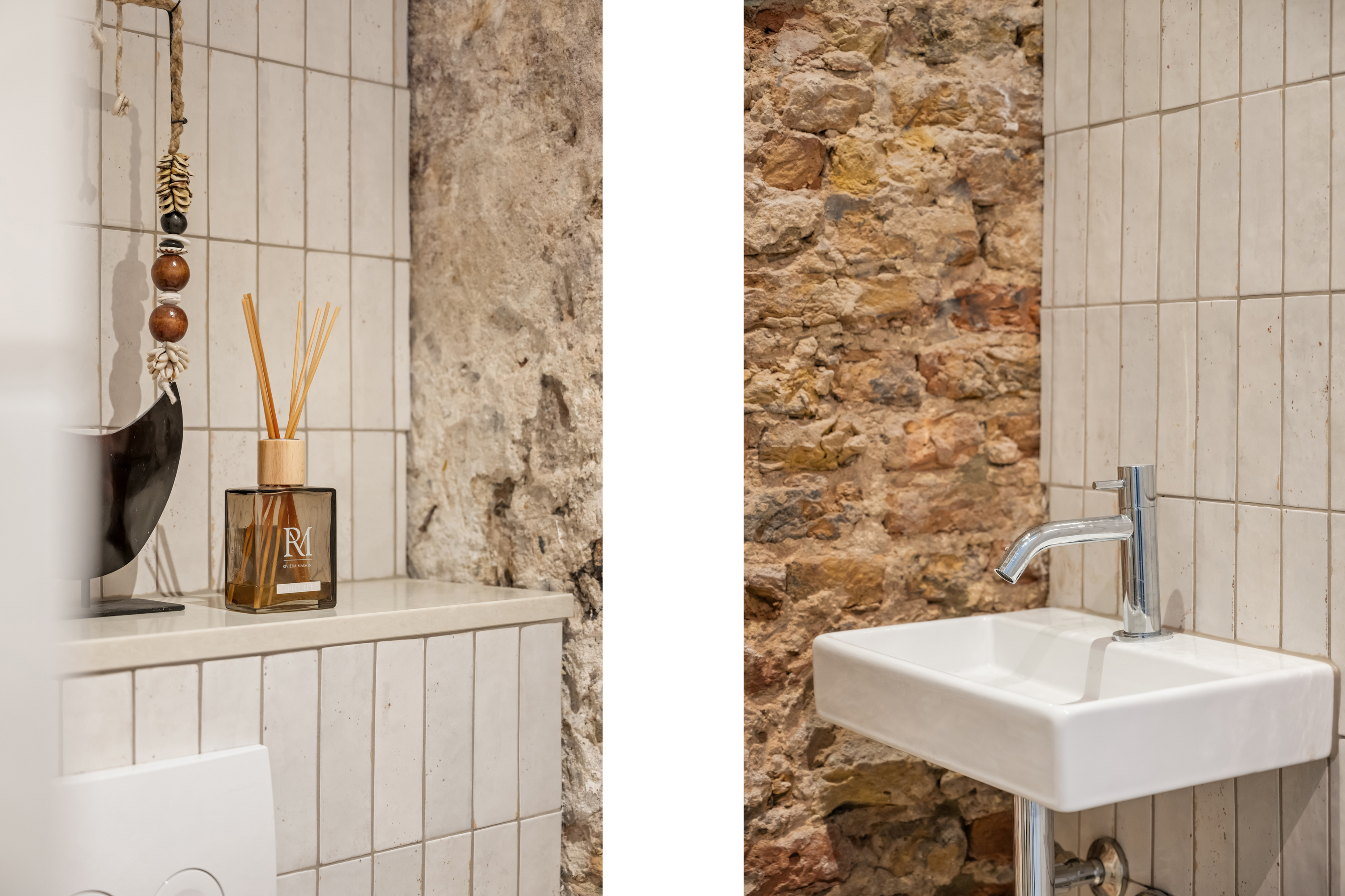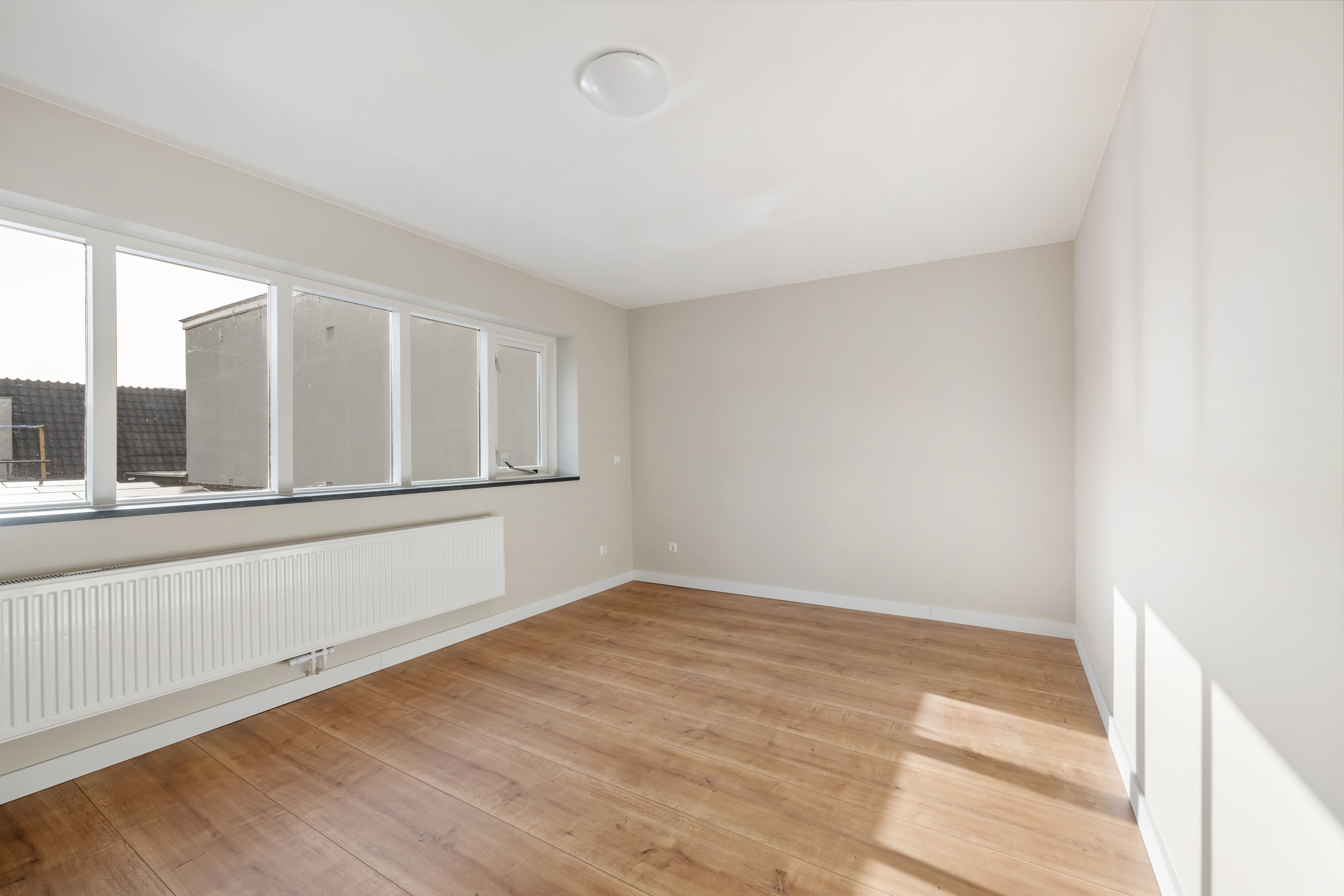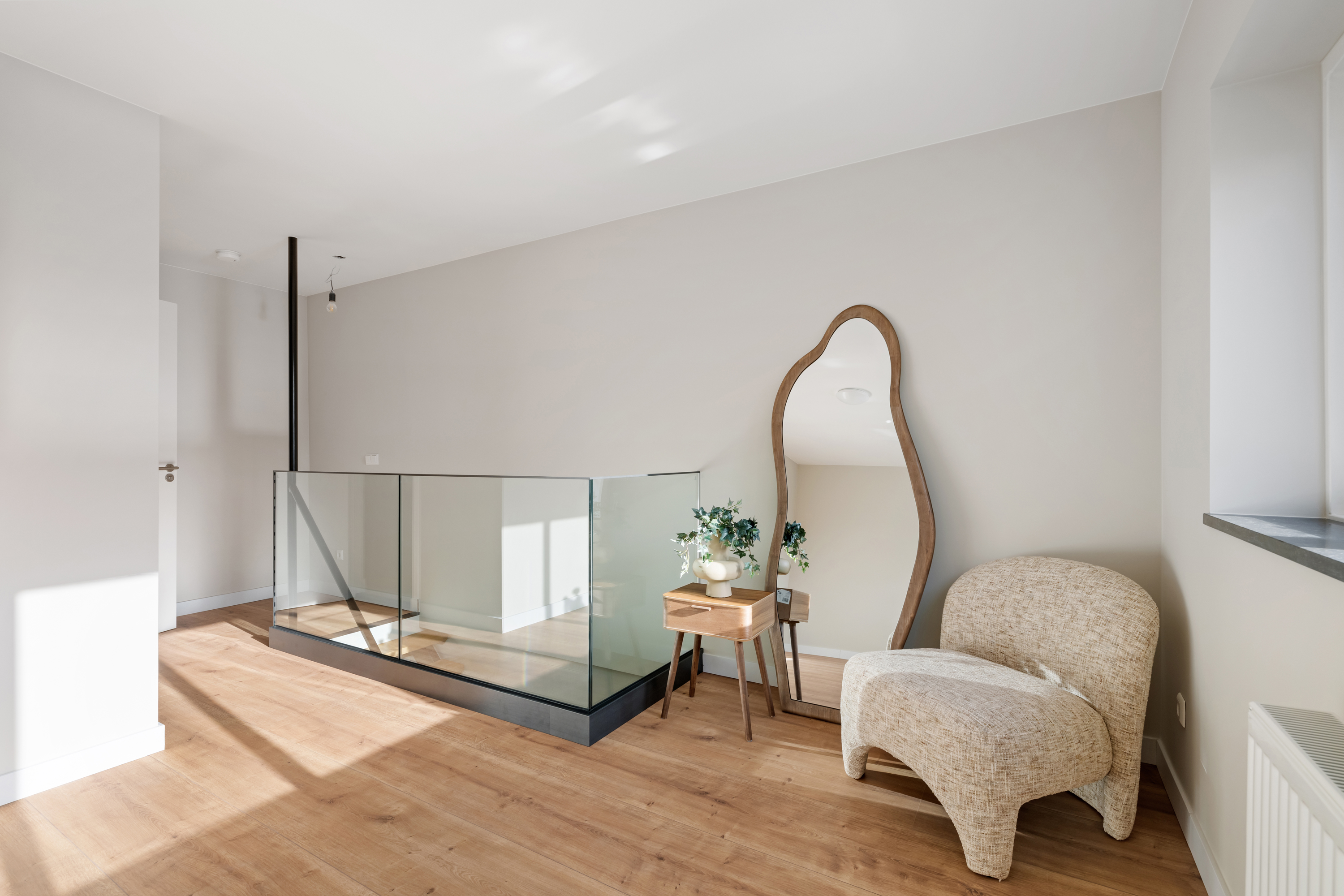 Op de 1e verdieping bevinden zich een ruime slaapkamer en een luxe, volledig nieuwe badkamer uit 2025, uitgerust met een dubbele wastafel, een royale inloopdouche en een tweede toilet.