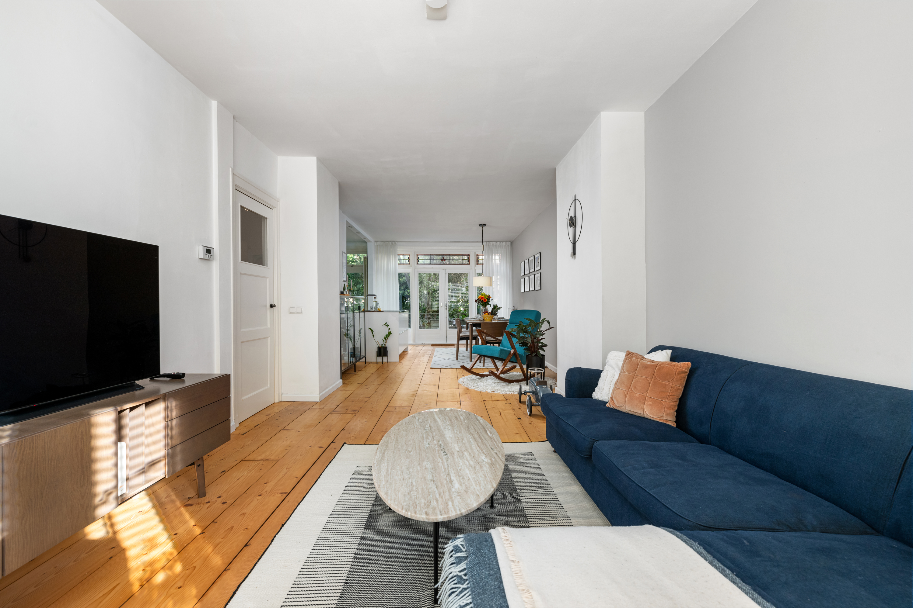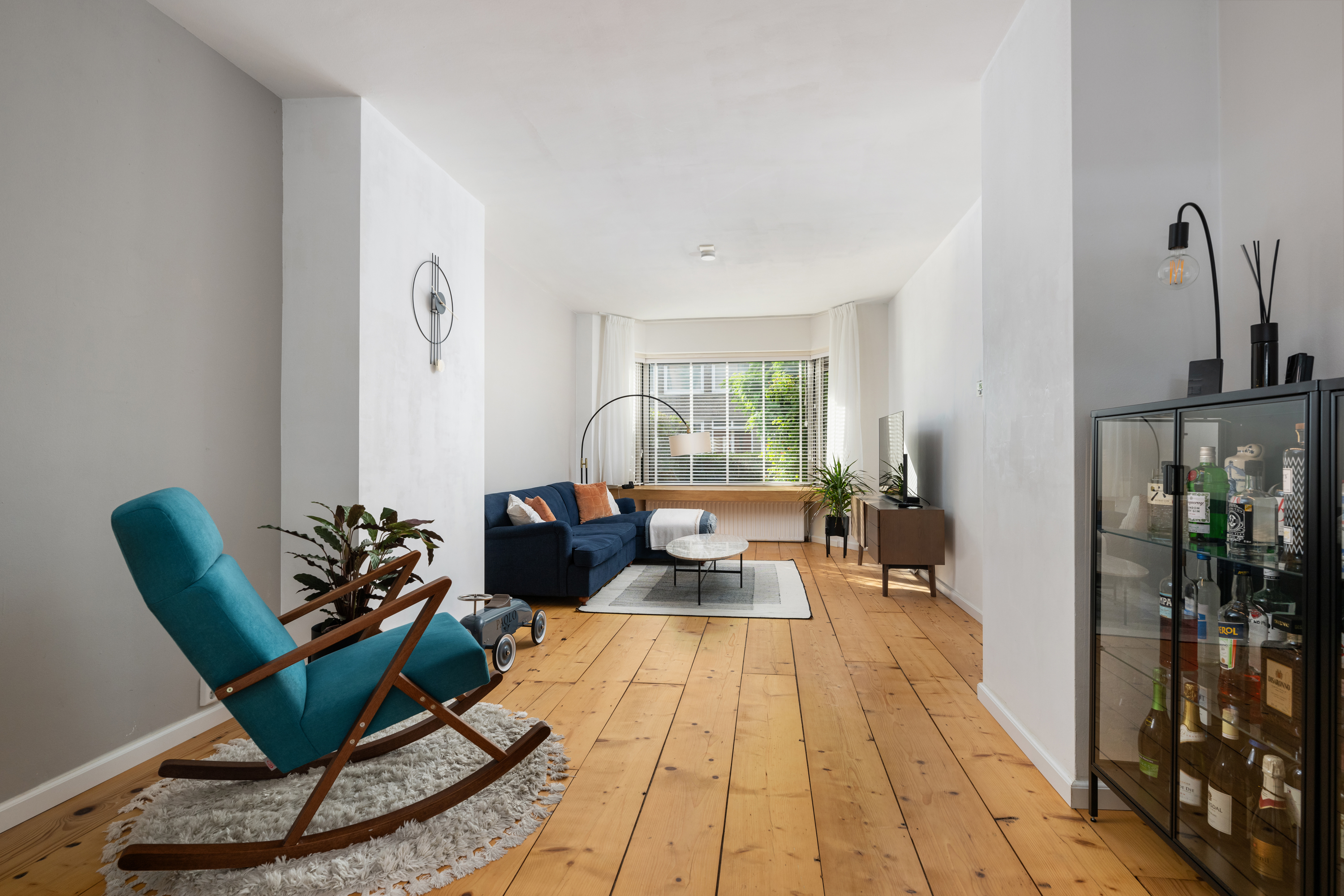 Je betreedt de woning via een charmante hal met klassieke details, die direct de sfeer van dit jaren ’30-huis neerzet. Aan de voorzijde bevindt zich een kamer die zich perfect leent als slaap- of werkkamer. De ruime woonkamer met open keuken vormt het hart van het huis: een lichte, uitnodigende leefruimte waar koken, eten en ontspannen moeiteloos in elkaar overlopen. De wanden en vloeren zijn perfect afgewerkt, het houtwerk strak in de lak. De deuren en deurposten lopen naadloos door.